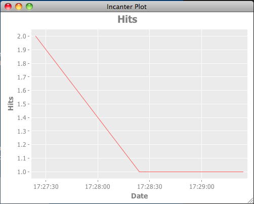 We’re not quite done yet though. We have our time-series records – representing one hit on our webserver – but don’t actually have values to graph. We also need to work out how we group hits to the nearest minute. What we’re going to do is replace our as-millis function to one that rounds to the nearest minute. Then, we’re going to use Incater to group those rows together – summing the hits it finds per minute. But before that, we need to tell Incanter that each row represents a hit, by adding a ‘Hits’ column. We’re also going to ditch the user column, as it isn’t going to help us here: